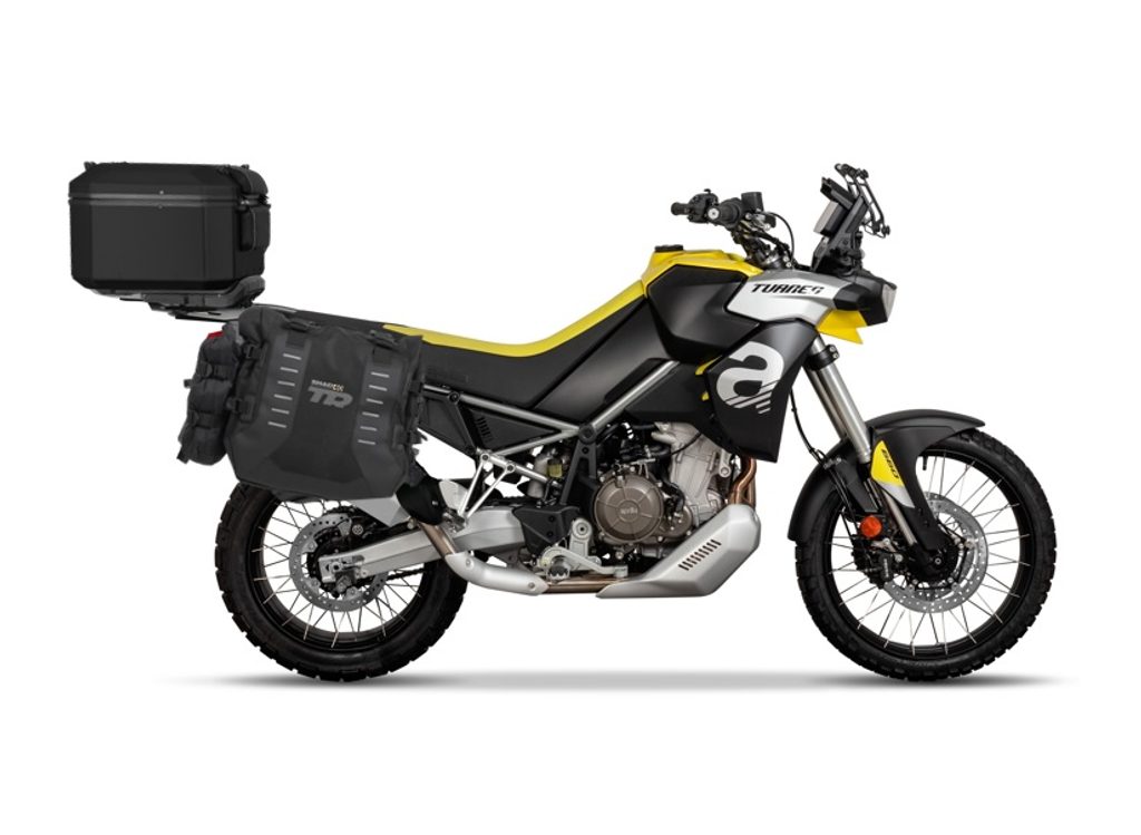 Sada ADVENTURE TERRA SHAD obsahuje sadu sedlových brašen TR40 určených pro jízdu v terénu a montážní sadu 4P SYSTÉM pro upevnění, také vrchní hliníkový kufr TR55 PURE BLACK včetně montážní sady TOP MASTER a plotny.