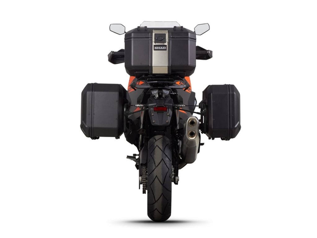 Kompletní sada černých hliníkových kufrů SHAD Terra obsahuje černý vrchní kufr TR37 s kapacitou 37L včetně plotny, levý černý hliníkový kufr TR47 s kapacitou 47L a pravý černý hliníkový kufr TR36 s kapacitou 36L kvůli umístění výfuku. Pravý kufr tak nebude vyčnívat. Sada obsahuje vše, co potřebujete k montáži obou kufrů.