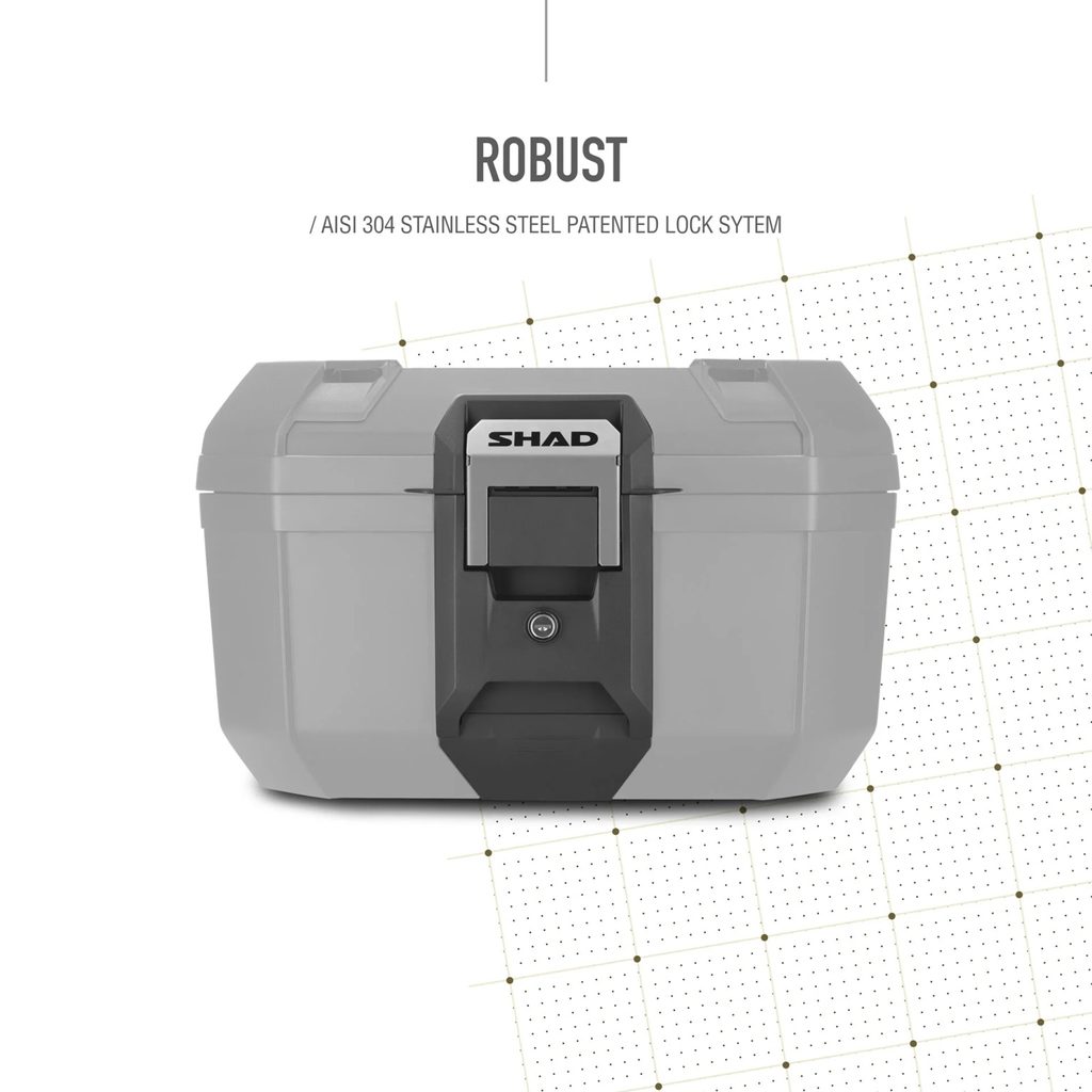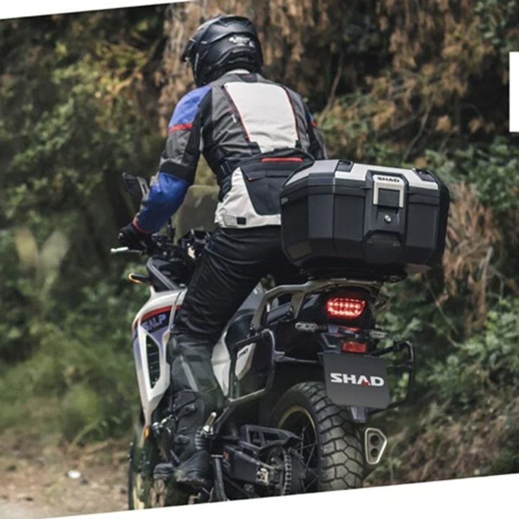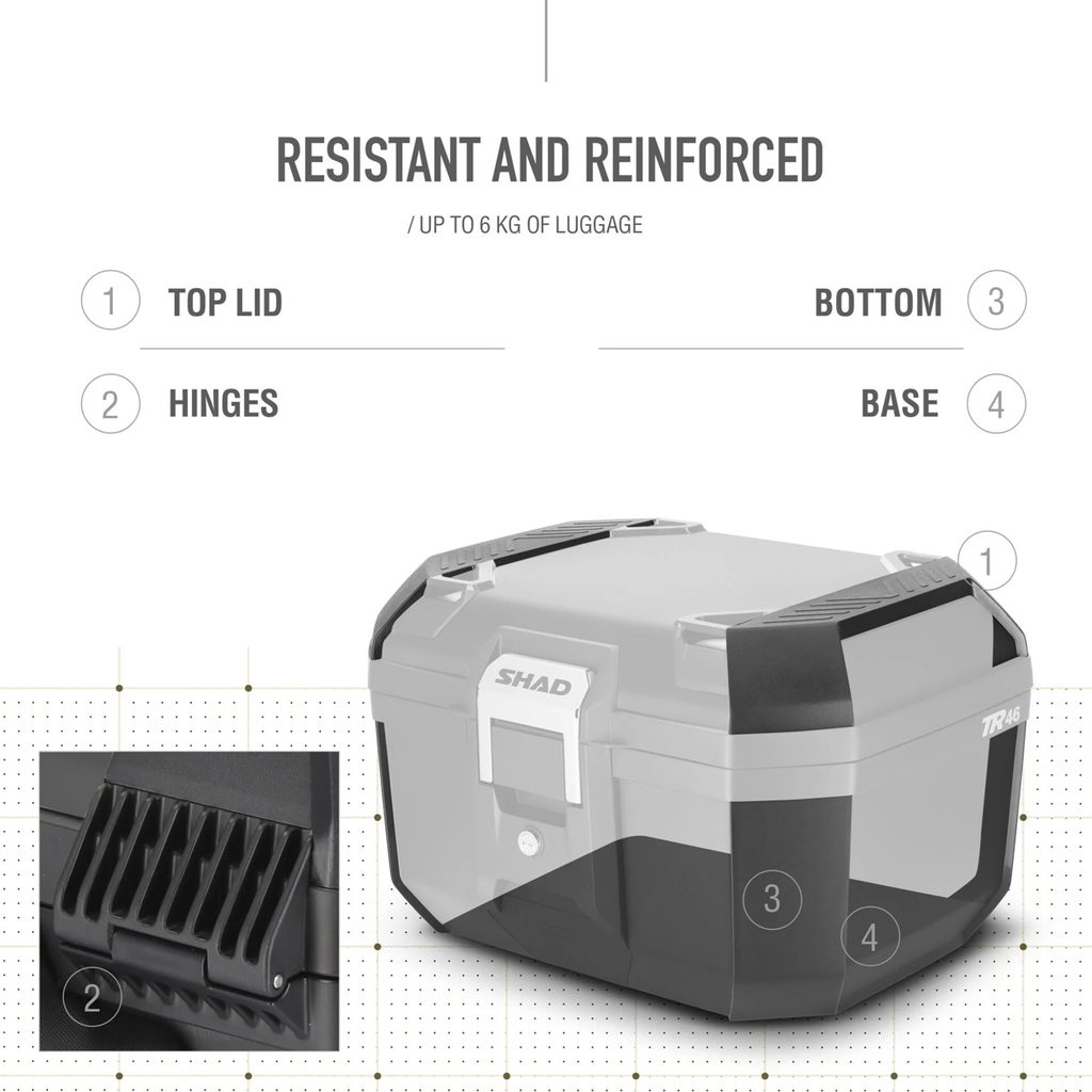 TR46 je odolný kufr navržený pro dobrodružství. Díky vysoce pevným materiálům a zesílené konstrukci základny spolu s horními rámy a centrální strukturou těla se jedná o pevný a robustní horní kufr. Obsahuje nerezový zámek s integrovanou rukojetí. S kapacitou pro dvě helmy (integrální a JET) unese maximální zatížení 6 kg.